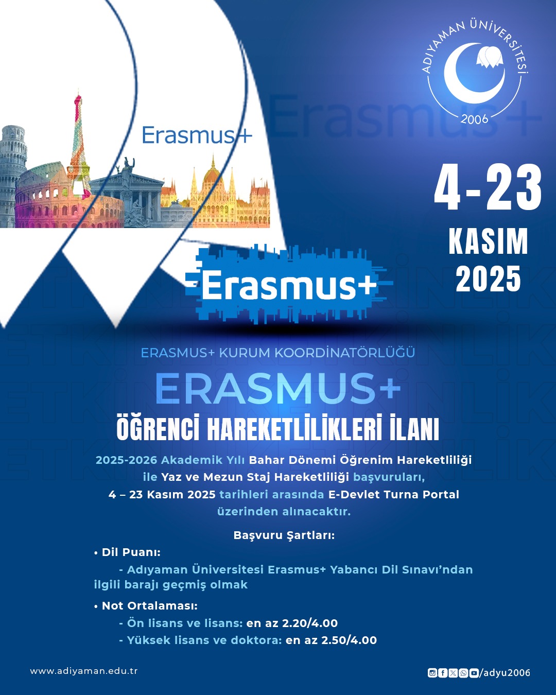 • Başvuru takviminde yaşanabilecek olası güncellemeler https://erasmus.adiyaman.edu.tr/ adresinden ve Instagram hesabından (www.instagram.com/adyuerasmus/) paylaşılacaktır. Öğrencilerimizin duyurularımızı düzenli olarak takip etmeleri önemle rica olunur.