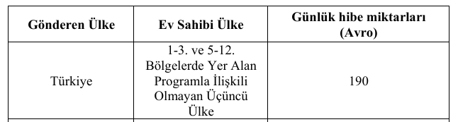 Personele, yurtdışındaki faaliyet süreleri boyunca masraflarının bir kısmının karşılanmasını sağlamak için günlük hibe + hareketlilik için 1 seferlik seyahat hibesi verilir. Personele verilecek hibe miktarı ve seyahat hibesi aşağıda yer almaktadır: