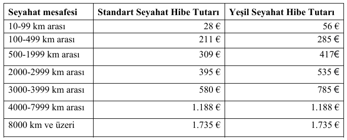 * Yeşil seyahat, düşük karbon emisyonlu ulaşımı kullanmak anlamına gelir. Buna otobüsler, trenler ve araç paylaşımı dahildir. Yeşil seyahat desteğine hak kazanmak için hem gidiş hem de dönüş yolculuklarınızda yeşil ulaşımı kullanmanız ve toplam yolculuğunuzun yarısından fazlasının yeşil araçlarla yapılması gerekir.